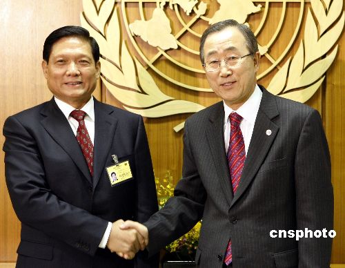 中共中央政治局委员、北京市委书记、北京奥组委主席刘淇三十一日在纽约联合国总部与联合国秘书长潘基文举行会晤。中新社发 李静 摄
