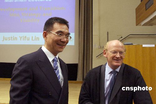 世界顶级经济学讲坛之一的剑桥大学“马歇尔讲座”每年邀请一位世界著名经济学家担任主讲人,北京大学中国经济研究中心林毅夫教授作为首个中国学者今年应邀主讲。中新社发 李鹏 摄