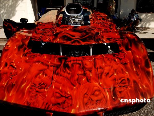 美国洛杉矶十月底万圣节前夕,街头展示独一无二的红色魔鬼跑车。中新社发 贾国荣 摄