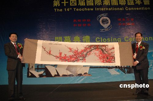 当地时间十一月四日,中国国务院侨务办公室副主任马儒沛(左)代表国侨办向第十四届国际潮团联谊年会赠送纪念品。中新社发 葛明 摄