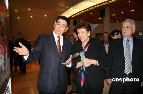 11月7日晚,由中国驻法使馆和法国奥委会共同主办的“北京欢迎您”迎奥运图片展,在巴黎法国奥委会总部、法兰西运动之家隆重开幕。旅法华人社团侨领等各界人士约400人出席了开幕仪式。图为中国驻法大使赵进军和法国卫生、青年与体育部长巴舍洛-纳尔坎女士,法国奥委会主席塞朗杜尔参观图片展。中新社发 钟诚 摄