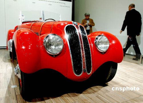 在洛杉矶举办的二00七北美国际车展上,一辆奔驰和一辆宝马老爷车向参观者述说着百年汽车文化传承至今的变迁历史。中新社发 贾国荣 摄