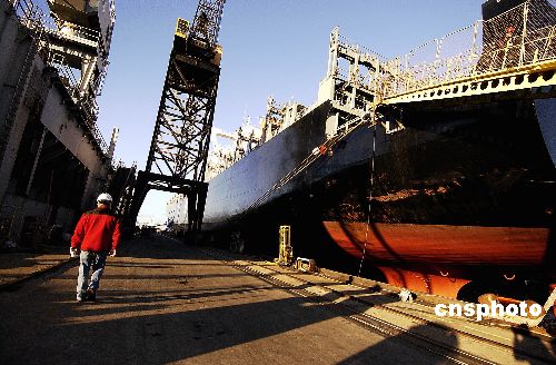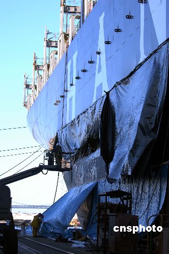 当地时间十一月十九日,与旧金山大桥相撞发生漏油事故的中远釜山号集装箱货船,已被拖至旧金山市的修理厂检查待修。中新社发 陈钢 摄
