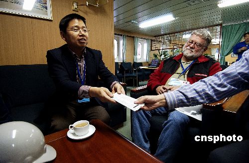 当地时间十一月十九日,中国驻旧金山总领馆官员再次登上已被拖至旧金山市修理厂的中远釜山号,向每位船员送去电话卡以便利与祖国亲人联系。该船在本月7日因与大桥相撞而受损。中新社发 陈钢 摄