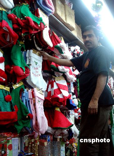 圣诞节临近,中国制造的节日饰品在纽约陆续登场。图为位于纽约曼哈顿中城一家商店的店员忙于上货,这位店员表示,这些饰品都是中国制造。中新社发 谭宏伟 摄