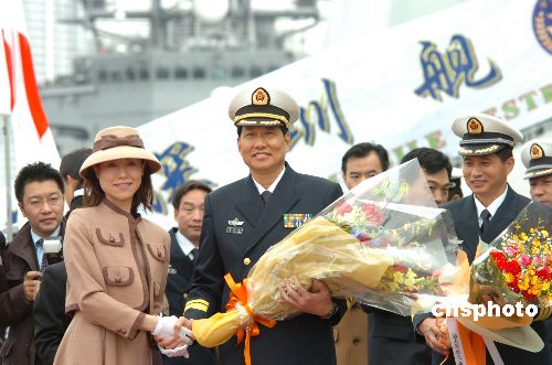 图为日本礼仪小姐向南海舰队副司令员肖新年少将献花。