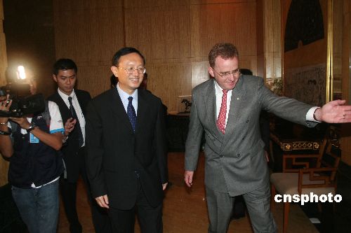 十二月七日傍晚,中国外交部长杨洁篪自伦敦飞抵吉隆坡,开始其就任外长后的首度访马行程。在马方接待人员和中国驻马大使程永华等中方人员陪同下,面无倦色的中国外长进住紧邻吉隆坡标志物双峰塔的东方文华酒店,受到酒店总经理舒曼(图右)欢迎。中新社发 苏祥新 摄