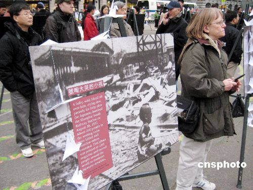 十二月九日下午,由纽约地区留学生、专家学者以及当地华人团体联合举办的南京大屠杀七十周年纽约纪念集会,在曼哈顿著名的联合广场举行。纪念活动展示大量史料图片展板,悼念大屠杀中遇难与受难的同胞,当地华人和纽约民众重温这段历史真相。活动中,现场演讲与观众签名抗议日本当局少数右翼分子否认和淡化这段惨绝人寰的侵略历史。中新社发 邓悦 摄