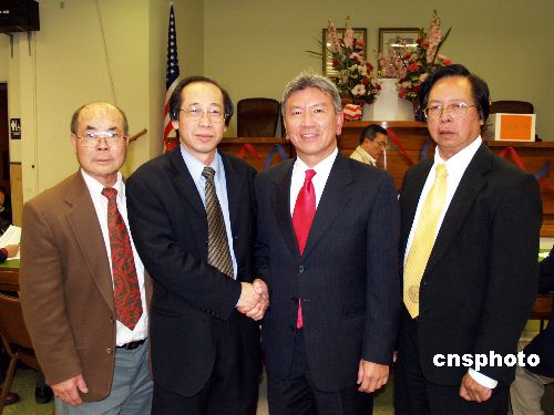 12月17日,美国洛杉矶华埠中华会馆已有114年历史,选出的2008年新一届主席伍竞群和副主席黄新周,在接受现任主席张自豪的祝贺。中新社发 卢威 摄