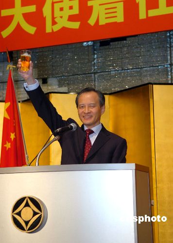 12月18日晚上,中国驻日使馆在东京新大谷饭店举行崔天凯大使到任招待会,日本各政党代表,政府各部门代表,各大企业代表以及在日华侨华人代表近200人参加。图为崔天凯大使在致词完后举杯祝酒。中新社发 滕剑峰 摄