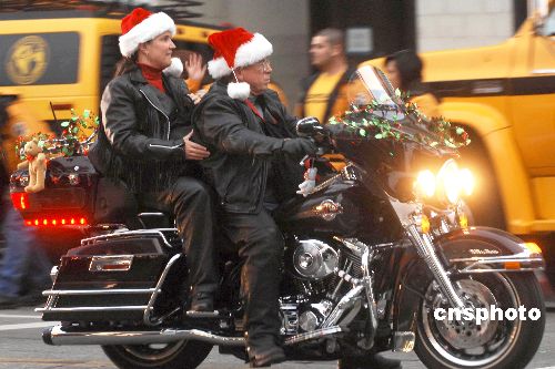 十二月圣诞节前夕,美国洛杉矶“哈雷”摩托车发烧友们成群结队驾驶爱车四处散发礼品,分享岁末佳节欢乐。中新社发 贾国荣 摄