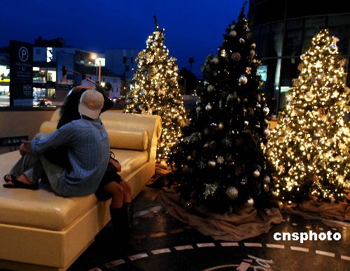 当地时间十二月二十四日,圣诞节前夕,洛杉矶一对有情人在圣诞树美妙的灯光下谈情说爱,享受浪漫时光。中新社发 贾国荣 摄