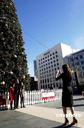 当地时间十二月二十五日,圣诞节的旧金山天气晴朗。图为一家美国人和树立在旧金山联合广场上的巨大圣诞树合影。中新社发 陈钢 摄