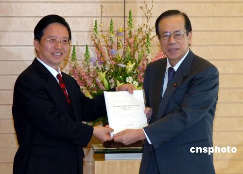 图为华人教授会代表朱建荣向福田康夫首相递交建议书。