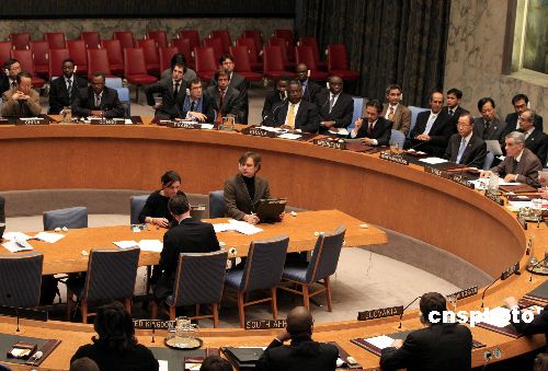 联合国安理会二十七日就威胁国际和平与安全的恐怖主义问题举行紧急磋商,并通过主席声明,用“最强烈的字眼”谴责当日早些时候发生在巴基斯坦的致使贝·布托遇害身亡的恐怖袭击事件。中新社发 李静 摄