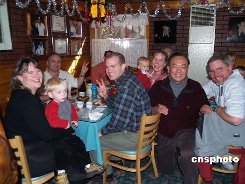 12月30日,不少美国人聚集在洛杉矶海拔6000英呎山上小镇“爱德沃德”唯一的中餐馆“又一村”进行“小年夜派对”,品尝地道的中国餐,迎接新年。店主叶志锜开店已20年,他是美国上海人联谊会首届荣誉会长。中新社发 卢威 摄