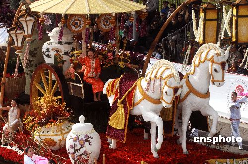 二00八年一月一日清晨,美国喜瑞都市华人女市长李栾复青,参加第119届帕沙迪纳元旦玫瑰花车大游行,并登车向民众致意。她是在历来玫瑰花车大游行中亮相的首位华裔女市长。中新社发 贾国荣 摄
