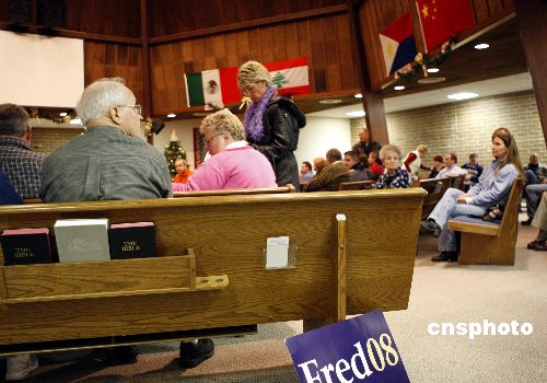 美国艾奥瓦州当地时间1月3日举行美国2008总统大选的首场初选。图为艾奥瓦中部小镇厄本代尔的一个共和党选区现场。共和党人赫卡比在当晚选举中胜出。中新社发 李静 摄
