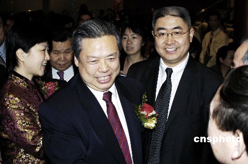 当地时间一月十日晚,美国纽约华人社团联席会属下二十七个侨团的五百多名侨界代表在纽约第二大中国城皇后区法拉盛举办隆重晚宴,欢迎中国驻纽约总领事馆总领事彭克玉履新。图为晚宴上彭克玉(中)与夫人杨京梅(左)在纽约华人社团联席会主席谢刚(右)的陪同下与热情的华侨代表会面。中新社发 邓悦 摄