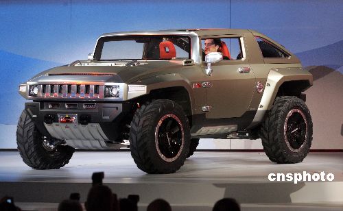 底特律当地时间一月十三日,在2008年北美国际汽车展上,通用汽车展示了悍马 HX 概念车。这款轻巧、可变化的越野车型是前卫、适于户外的入门级悍马,其鲜明的悍马设计,以及紧凑的、畅通无阻的驾驶理念,对当前的越野车市场发起挑战。据介绍,悍马HX 概念车,宽 2,057 毫米,轴距为 2,616 毫米。它发扬了悍马传奇般的越野精神,配备便于拆卸的车篷顶,能够适应不同越野环境的需要,同时满足不同的载货或乘坐的需求。它的设计理念来自三位刚刚加入悍马设计工作室的年轻设计师。中新社发 潘索菲 摄