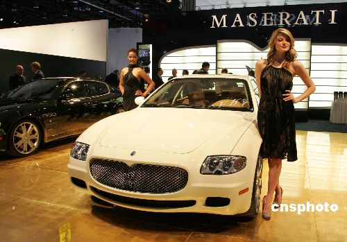 底特律当地时间一月十三日,在2008年北美国际汽车展上,玛莎拉蒂豪华房车与时尚美女华丽现身。中新社发 潘索菲 摄