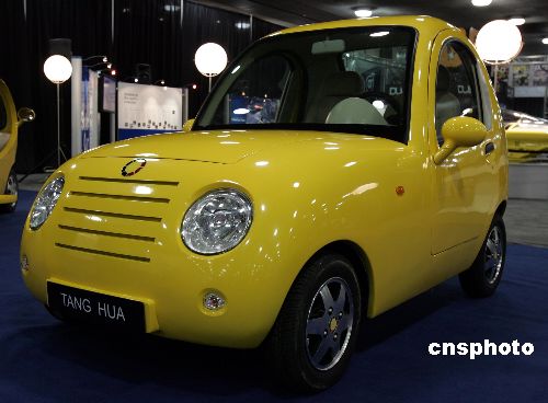 当地时间1月14日,一款名为“诗经”的迷你电池车在2008北美车展上与国际名车同台展示。这款由中国民营企业推出的迷你电池车,以中国文化和环保为理念,首次赴北美参展,由此希望进军北美和欧洲市场。中新社发 潘索菲 摄