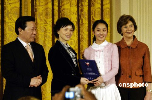 中国文化部部长孙家正(左一)今天上午在美国白宫与美国总统夫人劳拉·布什(右一)一起向中国福利会上海少年宫“小伙伴艺术团”代表陈白桦老师(左二)、李蒙初同学(右二)颁发“站得更高”奖状。中新社发 邱江波 摄
