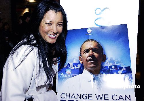 当地时间1月29日,美国好莱坞华裔女星胡凯莉露面旧金山,出席亚裔社区支持奥巴马参选总统的集会。胡凯莉曾获得夏威夷小姐称号,和美国民主党总统参选人奥巴马都曾有在夏威夷生活过的经历。中新社发 陈钢 摄