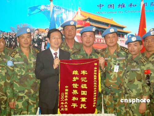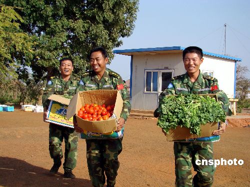当地时间2月3日下午,中国驻苏丹大使李成文在董建东武官的陪同下,带领中国石油天然气集团公司代表一行5人乘专机前往苏丹南部城市瓦乌,慰问中国驻苏丹维和工兵、运输、医疗分队。李大使代表中国驻苏丹大使馆向维和部队赠送一面镶有“牢记祖国重托、维护世界和平”字样的锦旗及慰问品。随同的中国石油天然气集团公司代表向维和部队赠送1000余公斤新鲜蔬菜。中新社发 刘恩海 摄