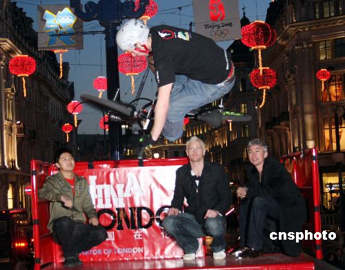 当地时间6日晚,田亮和两名英国前世界冠军——三级跳远选手乔纳森·爱德华兹和四百米运动员伊万·托马斯共同在伦敦市中心启动了高悬在牛津街上的大红灯笼,“中国在伦敦二00八”系列中国新年庆祝就此开幕,图为田亮(左一)、爱德华兹(右一)和托马斯(中)在观看小轮车选手的高空特技表演。中新社发 李鹏 摄