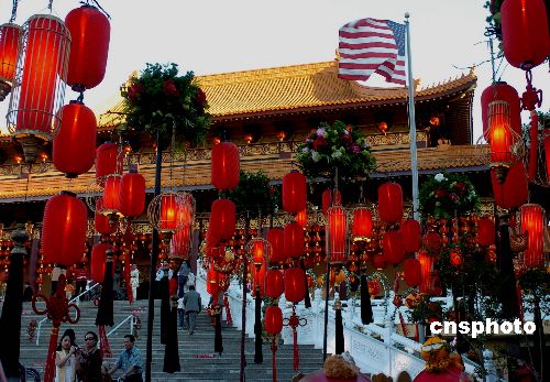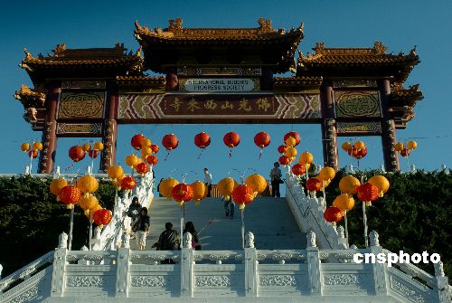 美国洛杉矶中国传统建筑特色的西来寺当地时间二月七日举办新年灯会,华人华侨扶老携幼前来欢度鼠年春节。中新社发 贾国荣 摄