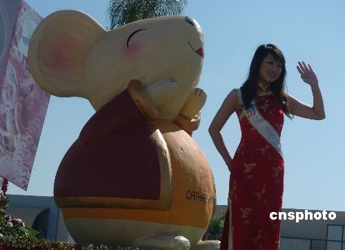 新届华埠小姐在吉祥鼠卡通前与各族裔民众欢度中国正月新年。