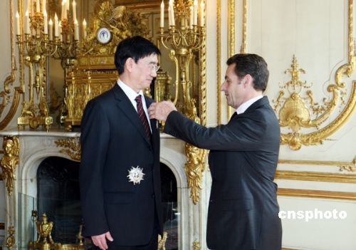 法国总统萨科奇2月18日在爱丽舍宫授予即将任满回国的中国驻法大使赵进军“法国荣誉勋位团大军官勋章”,以表彰他多年来为推动法中两国友好关系的发展和两国人民之间的相互了解所做出的杰出贡献。中新社发 钟诚 摄