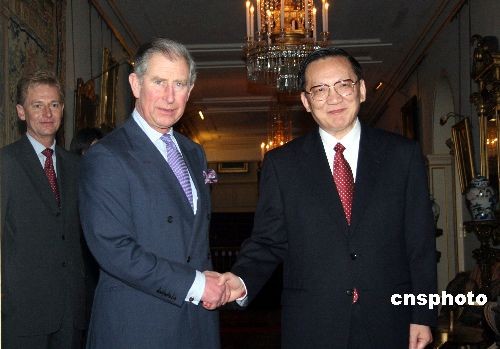当地时间十九日下午,英国王储查尔斯在其官邸克拉伦斯宫会见正在此间访问的中国国务委员唐家璇(右)。中新社发 李鹏 摄