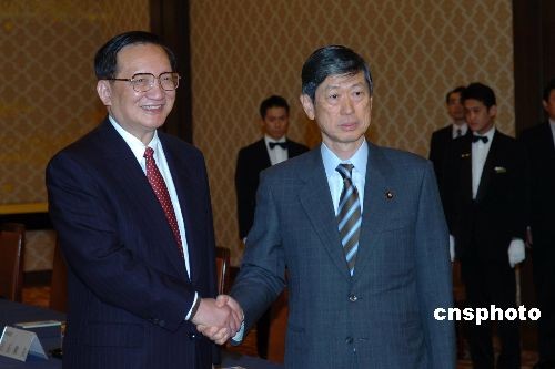 2月21日下午,正在日本进行正式访问的中国国务委员唐家璇在东京饭仓公馆会见了日本外相高村正彦(右)。中新社发 滕剑峰 摄
