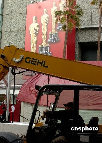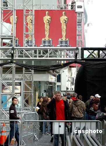 当地时间二月二十一日,美国洛杉矶好莱坞星光大道已经封锁主要道路,为二月二十四日举行美国第八十届电影奥斯卡颁奖典礼作准备。中新社发 贾国荣 摄