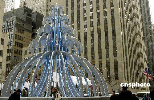 由两名英国艺术家创作的“电子喷泉”街头装置艺术品于27日在纽约著名的洛克菲勒中心广场揭幕。这个重达6万多磅的钢筋喷水池装点了3390颗灯泡来模拟喷水状态,“水柱”最高达10米多。中新社发 邓悦 摄