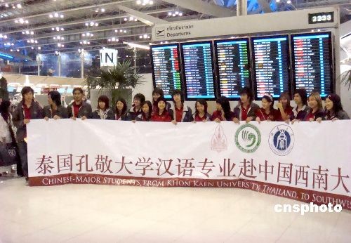 来自泰国孔敬大学孔子学院的五十七名泰籍本科生带着家长与老师的谆谆教诲五日飞往重庆中国西南大学,开始他们在中国为期两年的学习生活,这标志着泰国孔敬大学孔子学院与中国西南大学的“一加二加一汉语本科”合作项目正式启动。孔敬大学孔子学院院长黄小明说,今天飞抵重庆的学生是两校合作项目“一加二加一汉语本科”招收的第一批学生,本意是第一、第四年在泰国,第二、第三年在中国学习,毕业时学生们将得到中泰两校颁发的毕业证书。中新社发 顾时宏 摄