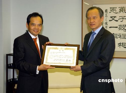 3月6日下午,日本零售业巨头之一永旺集团董事长兼总经理冈田元也来到中国驻日大使馆,委托使馆向中国卧龙熊猫基地捐款2500万日元。图为接受捐款后,中国驻日大使崔天凯(右)向冈田元也(左)颁发奖状。中新社发 滕剑峰 摄