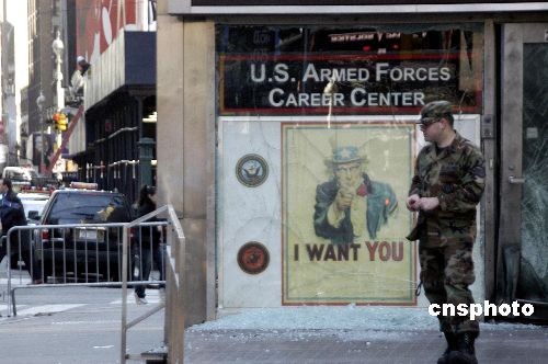 3月6日凌晨3时45分左右,纽约时代广场一征兵点门口发生爆炸,但没有造成人员伤亡。纽约警方称,事发当时该征兵点无人驻守,爆炸仅造成该征兵点门窗破损,目前相关调查正在进行当中。中新社发 谭宏伟 摄