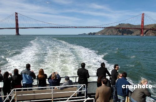 3月初的美国旧金山阳光明媚,大批游客乘坐旅游船观赏金门大桥的雄姿。首批中国赴美旅游团有望在今年夏天成行,中国内地旅游社已着手设计赴美旅游线路,其中拥有广泛知名度的旧金山金门大桥将成为必选景点。中新社发 张炜 摄