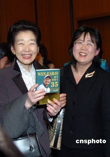 3月7日晚,在中国驻日大使馆举行的庆祝三八国际劳动妇女节招待会上,日本侨报社长张景子向日本首相夫人福田贵代子和少子化对策专任大臣上川阳子赠送了该社出版的日文版《35号投手温家宝》。中新社发 段跃中 摄