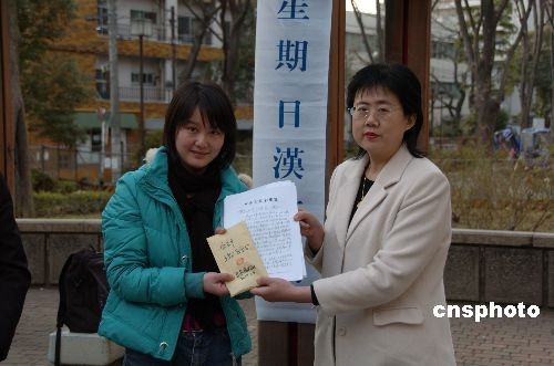 3月9日,日本东京汉语角举行的第30次交流会上,日本侨报社社长张景子(右)代表中日两国的捐款者,把全部捐款和写给湖南省长周强的信,转交给了正在日本访问的湖南省人民对外友好协会干部曾卓然(左),表达大家对湖南灾区人民的关切之情。近一个月来,日本侨报社组织的为湖南灾区人民捐款活动,共收到4个团体、53位日本友人和在日华人的全部捐款38.2885万日元。中新社发 段跃中 摄