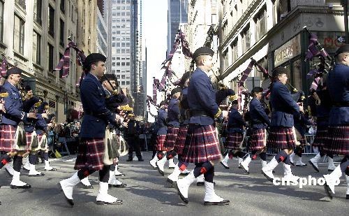 图为身着爱尔兰民族服饰的游行队伍走过第五大道。