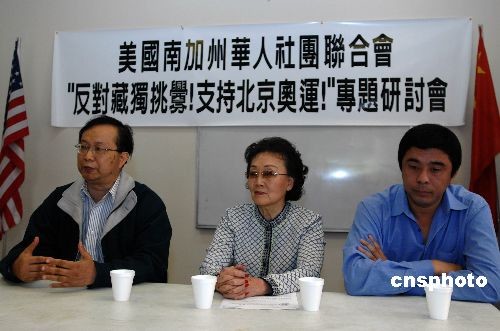 当地时间4月2日,美国南加州华人社团联合会举行“反对藏独挑衅、支持北京奥运”座谈会。美国南加州华人社团联合会主席张素久(中)和美国北京联合会会长燕青(右)等发言谴责拉萨‘三·一四’打砸抢烧暴力事件。旅美资深评论员郑浪平(左一)特别赞扬中国爱国青年自发反击某些西方媒体歪曲报道的行动。中新社发 张炜 摄