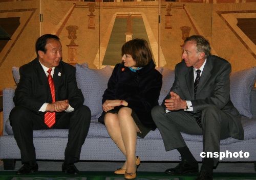 当地时间4月5日晚,北京奥运圣火抵达伦敦,英国奥运大臣泰萨·乔维尔等在机场迎接圣火。图为乔维尔(中)与北京奥组委执行副主席蒋效愚(左)在机场会面,谈及北京奥运会的筹备情况等。中新社发 李鹏 摄