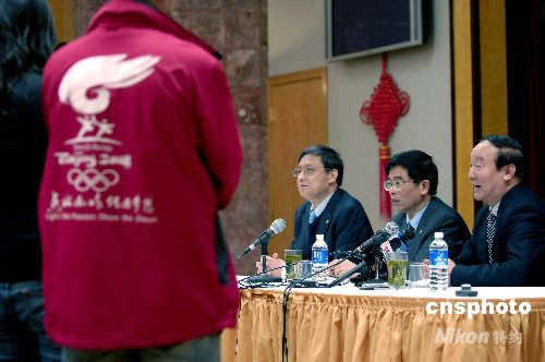 当地时间四月十日,中国驻美大使周文重(右三)和北京奥组委执行副主席蒋效愚(右一), 在旧金山举行记者会,感谢华人华侨对北京奥运会的支持和美国人民对圣火传递的热情参与。中新社发 陈钢 摄