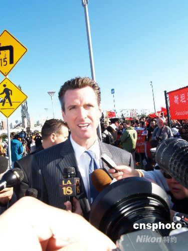 图:旧金山市长纽森被媒体“包围”