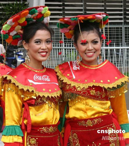 4月22日下午3时30分,印尼青体部部长阿迪亚克萨·道尔特用手中的“祥云”火炬点燃圣火盆,北京奥运圣火在雅加达的传递顺利结束。北京奥运圣火雅加达站传递从苏加诺体育中心东门开始后,八十名火炬手围绕其中的苏加诺体育场进行七公里左右的传递。八十位火炬手中,有印尼现役和退役优秀运动员、赞助商代表、政府官员、社会活动家等。21日晚10时,北京奥运圣火将离开雅加达,前往下一站——澳大利亚的堪培拉。图为印尼当地妇女盛装欢迎奥运圣火。 中新社发 沈晨 摄