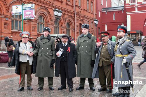 今年4月22日是列宁诞辰138周年纪念日,俄罗斯各地民众向列宁纪念碑等敬献花圈,并举行各种纪念活动。图为红场入口处的列宁、斯大林、沙皇的扮演者们,与俄罗斯士兵合影。中新社发 田冰 摄